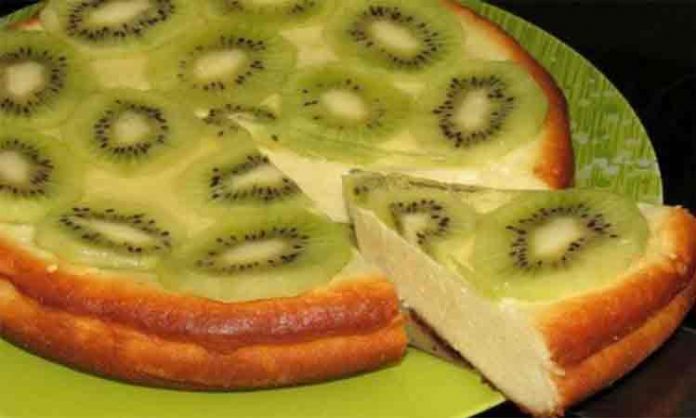 Se acoate din forma cand se mai raceste. Taiati kiwi in felii si asezati deasupra prajiturii racite. Gelatina de tort se dizolvă după cum este scris pe plic, se pune peste fructe si se da prajitura la rece pana cand se solidifica. Se taie felii in momentul servirii.