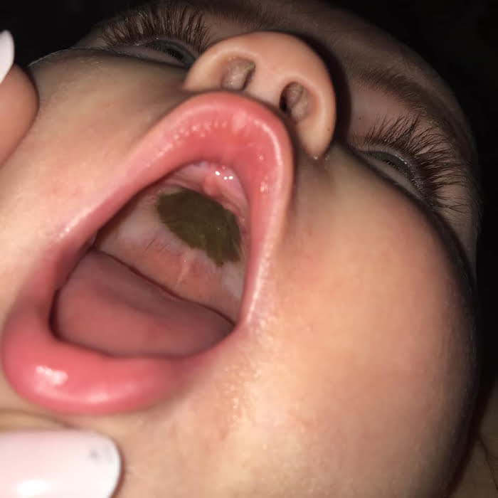 La un control mai atent aceasta o observat ceva in partea superioara a gingiei. In prima faza nu a realizat exact ce este acolo. Cu ajutorul unei pensete a extras corpul strain din gingia copilului si nu-i venea sa credea ce a gasit.